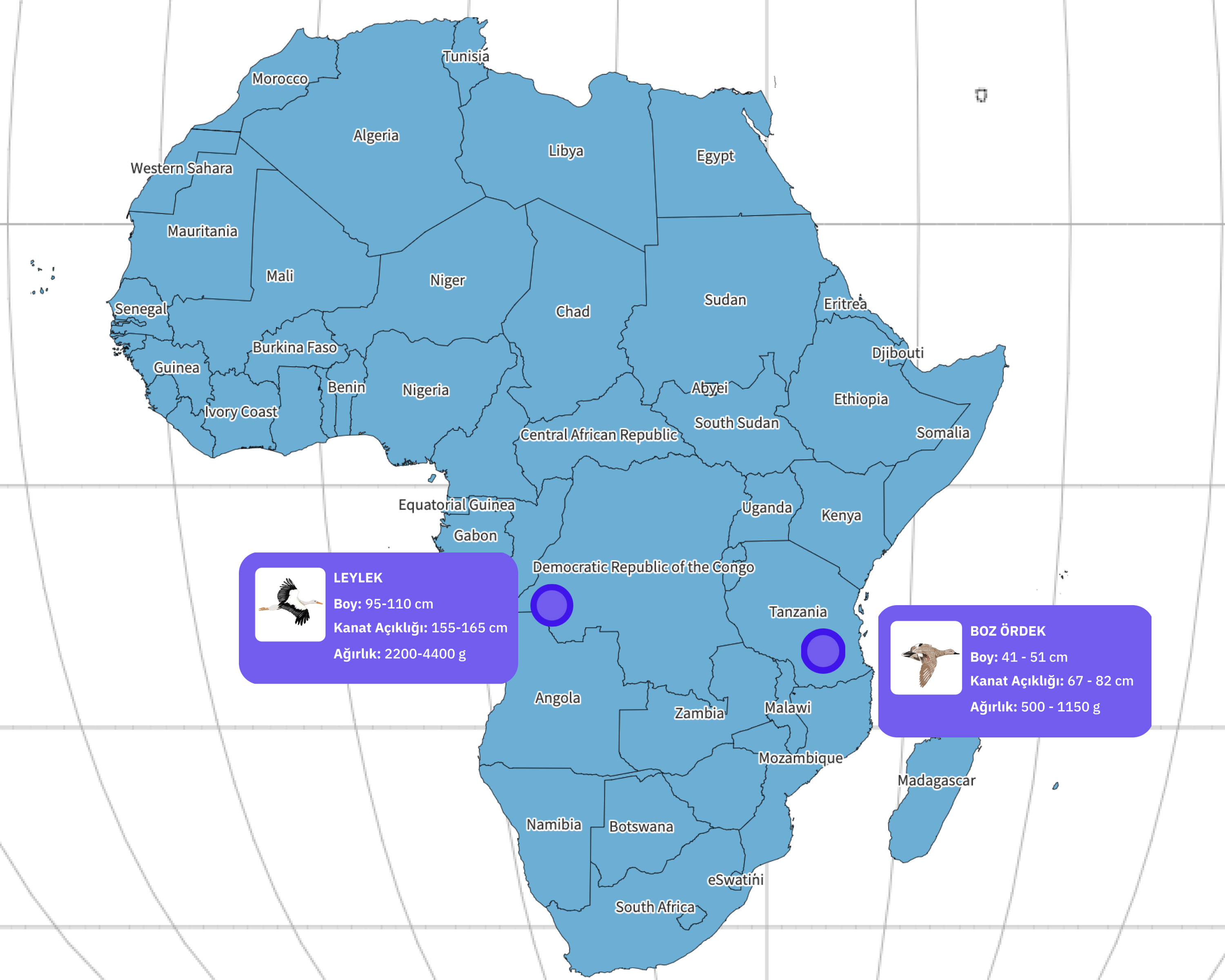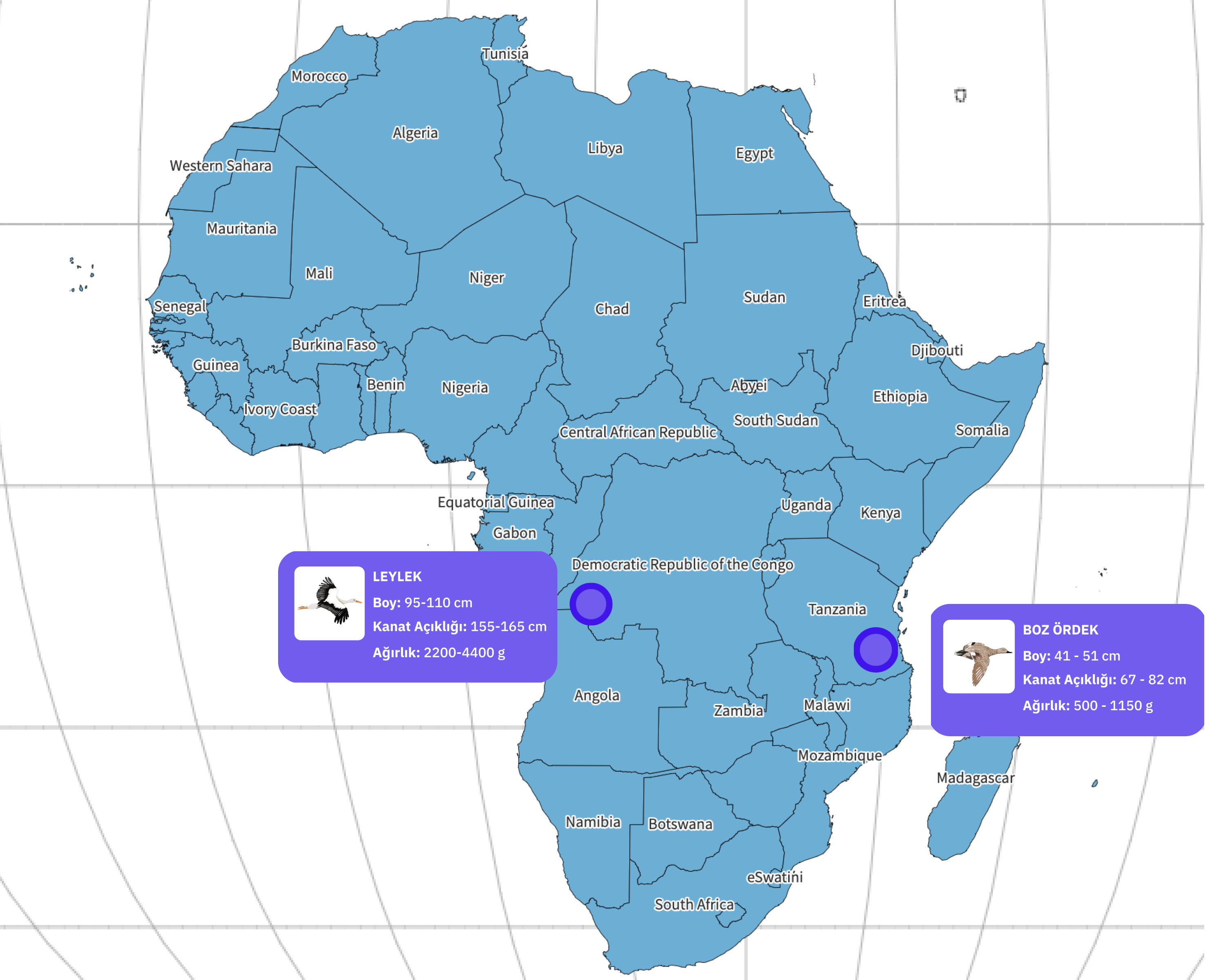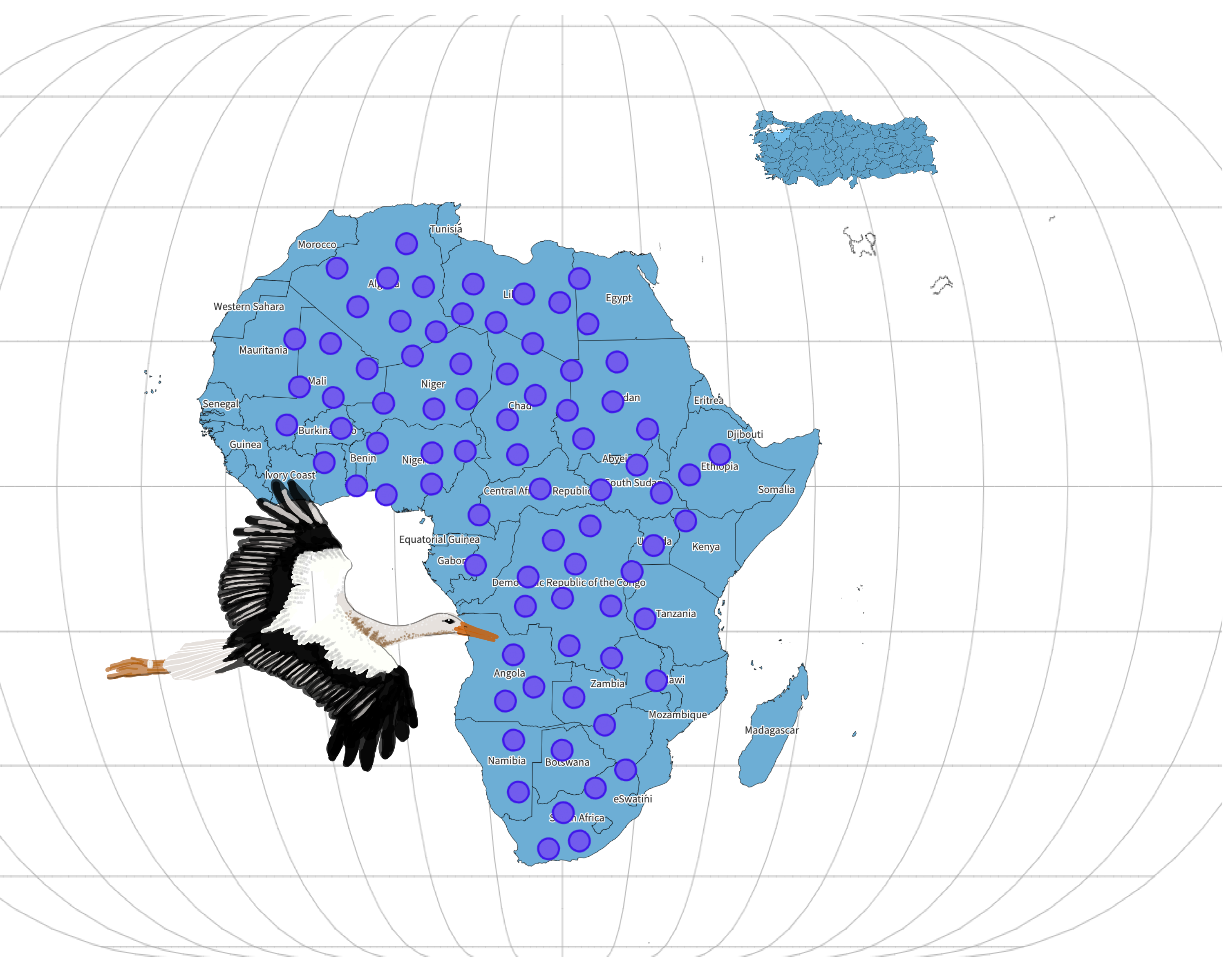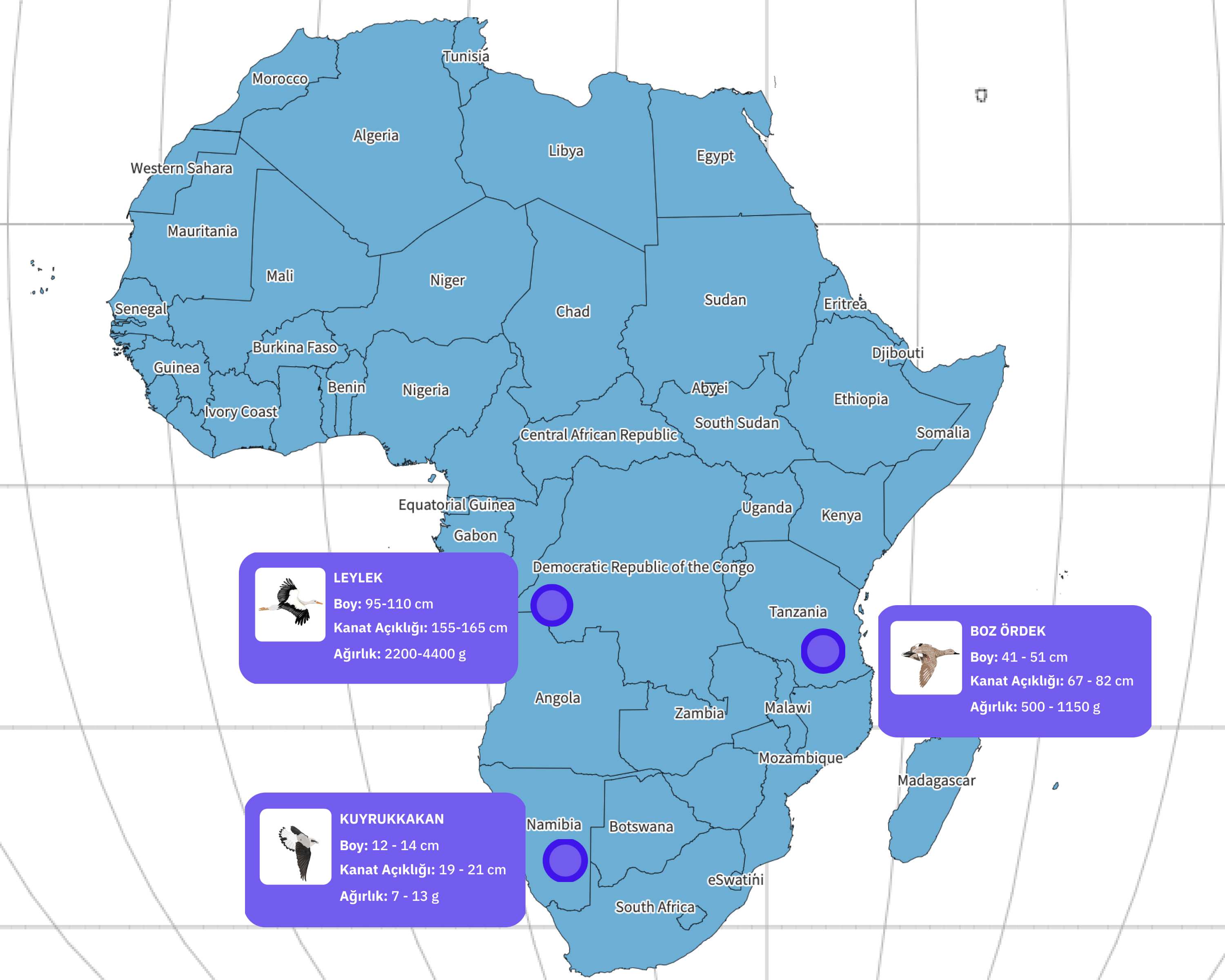 Migbird isimli uygulamada Türkiye’de görülen göçmen kuş türlerinin veri aktarımı yapılmaktadır. Dünya haritasında Türkiye ile Afrika kıtası arasında göç eden 100 kuş türünün bulundukları noktalar görülmektedir.