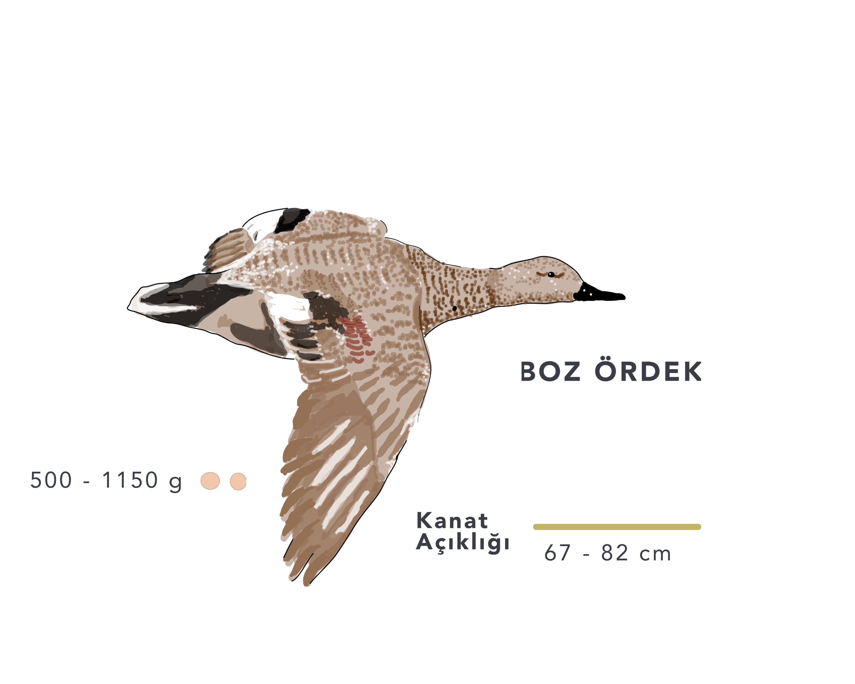 Boz Ördek (Anas streoera), Anatidae familyasındandır. Uçarken ikinci uçma tüylerinde beyaz ve siyah renkleri panel, omuz tellerindeki kestane-kahverengi renk ile karındaki beyazlık göze çarpar. Boz ördekler, su ortamında yaşayan bitkilerle beslenen otobur kuşlardır. Su altında dalış yaparak bitki kökleri, su altı bitkileri ve su yüzeyindeki bitkisel materyallerle beslenirler. Ayrıca sucul böcekler, kabuklular ve küçük balıklar da beslenmelerinin bir parçası olabilir.