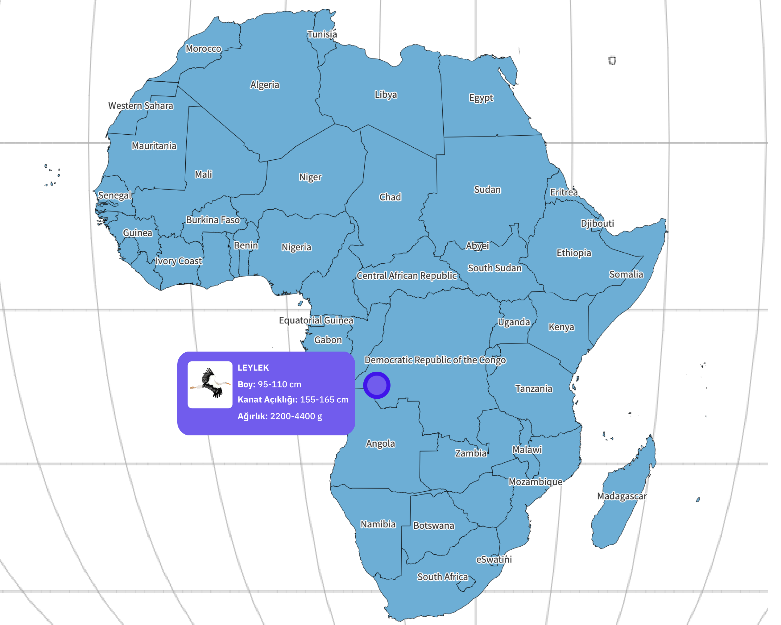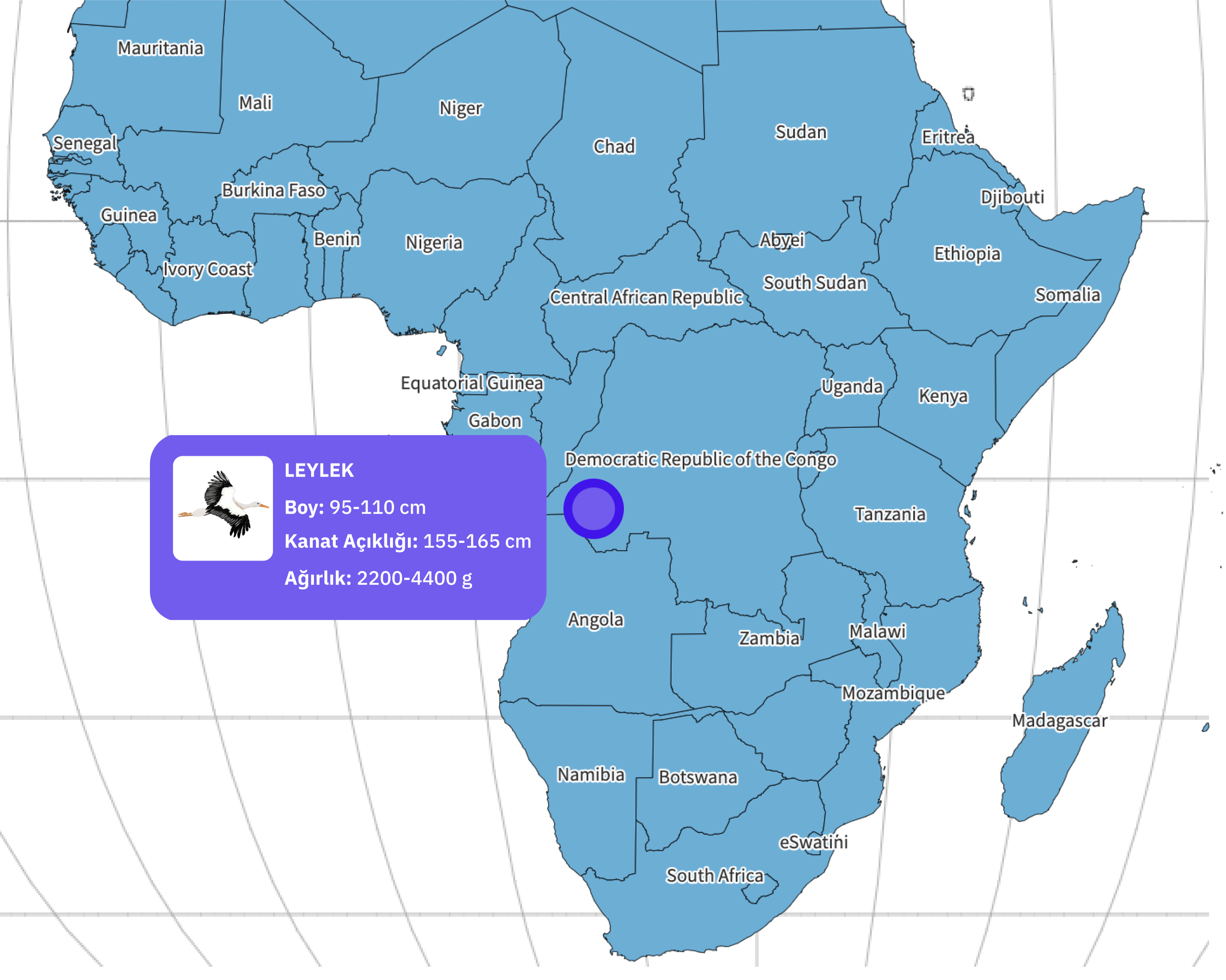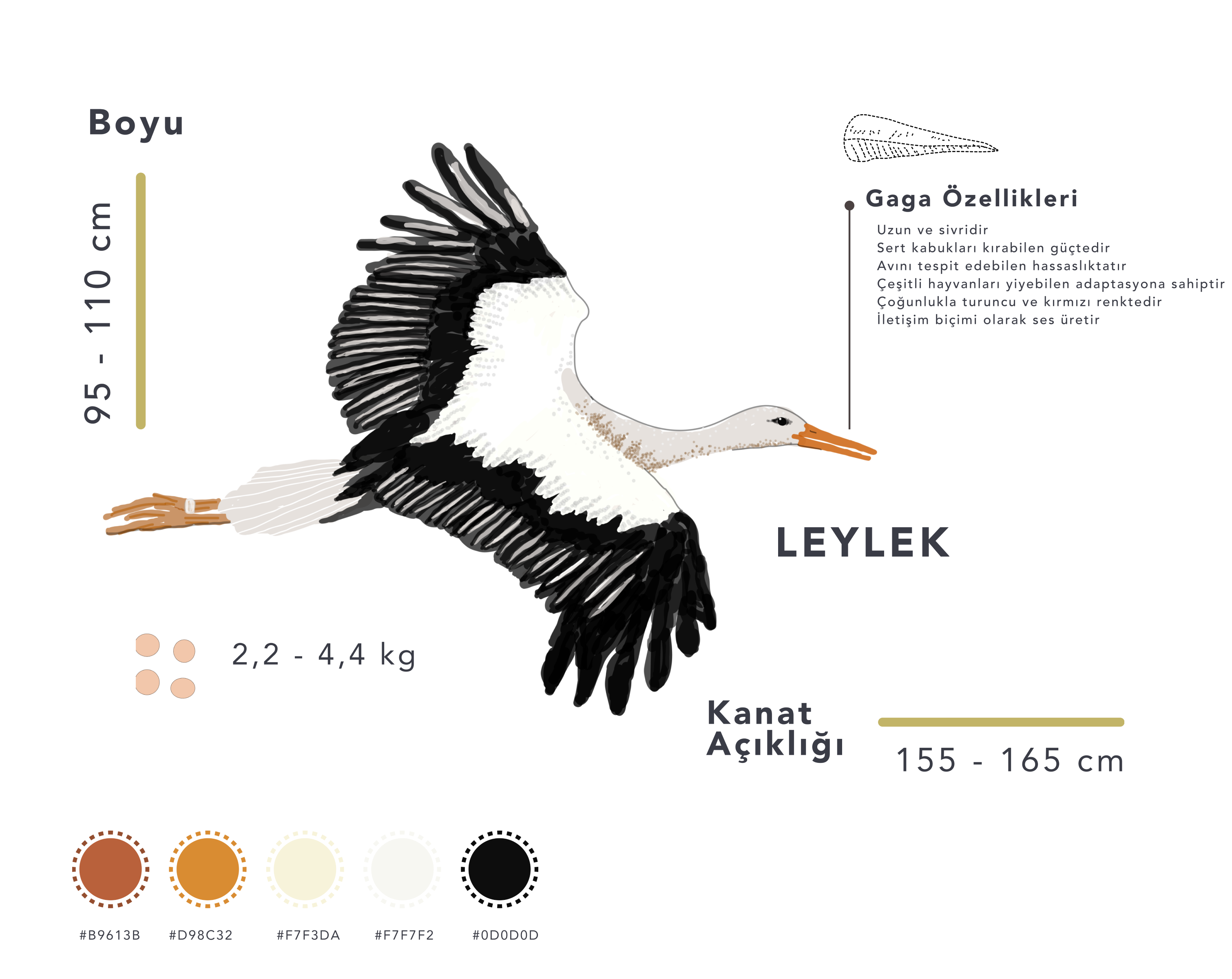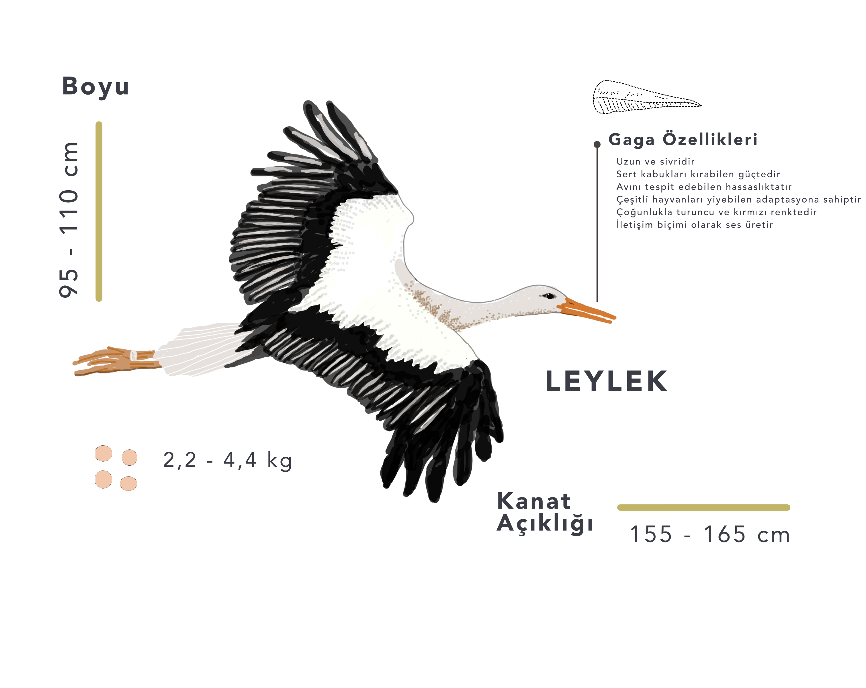 Kuş türleri arasında bulunan Leylek türünün boyu, kanat açıklığı, ağırlığı ve konum bilgisi verilmektedir.